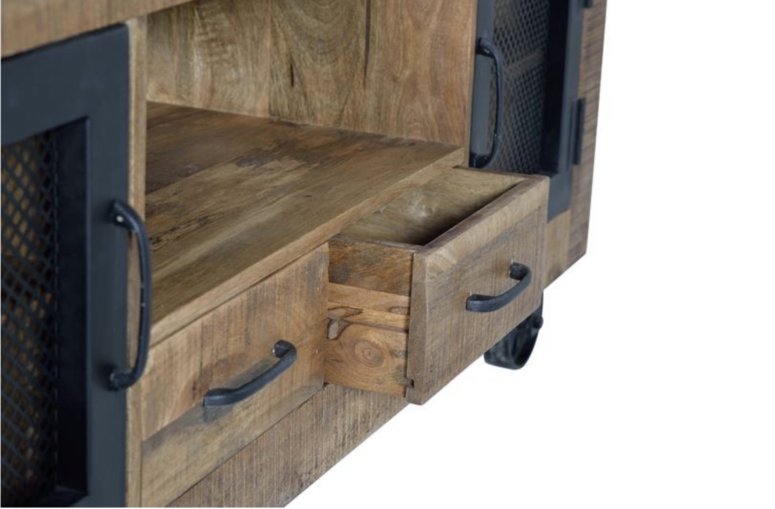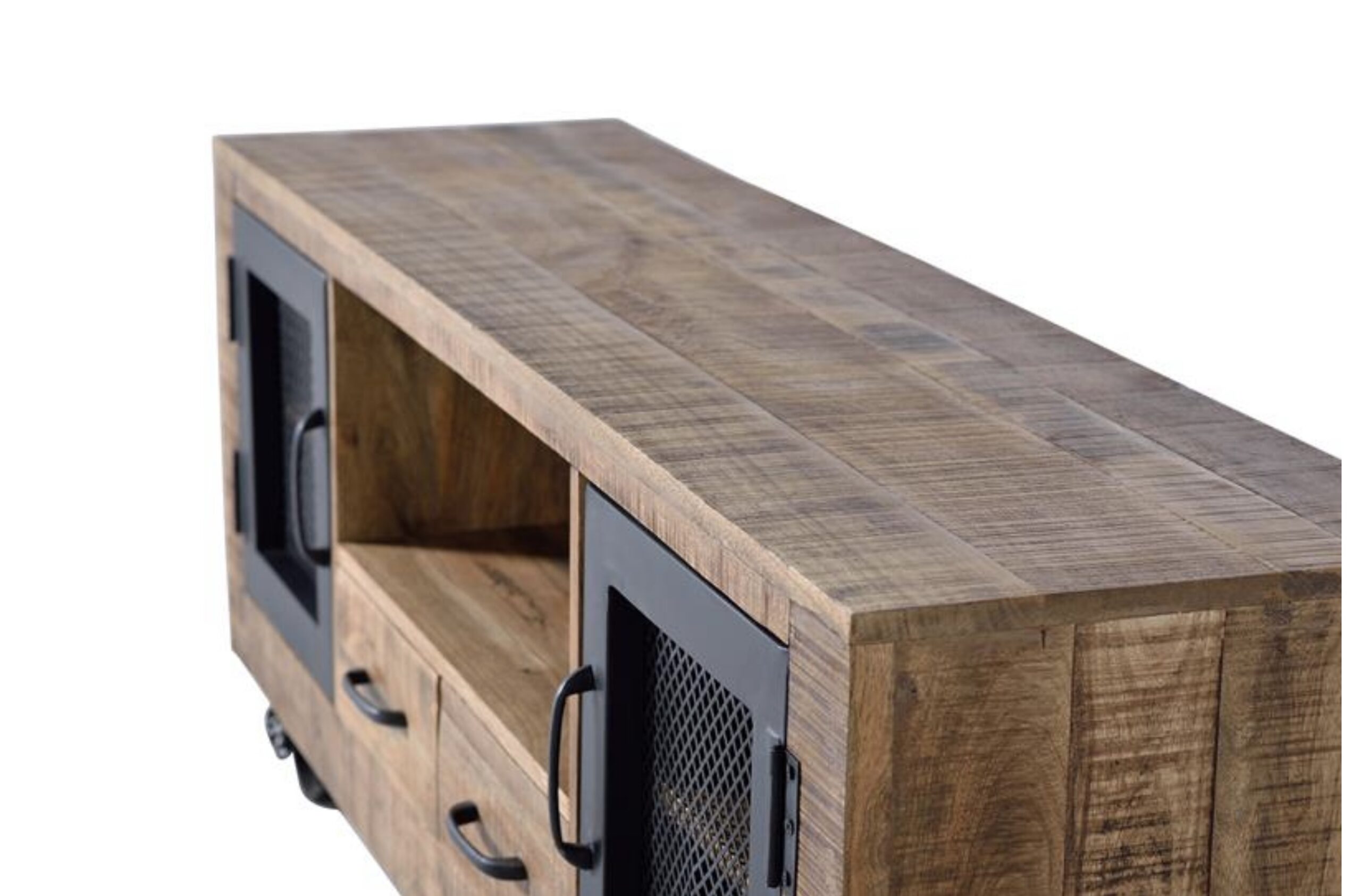 Mueble de televison estilo industrial con estructura de madera y puertas de metal