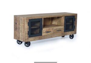 Aparador 3 cajones y 2 puertas de estilo industrial en madera de mango. Puertas y ruedas de metal, con estantes interiores.