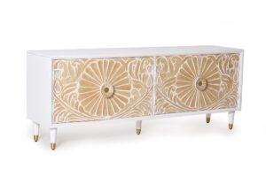 El armario Breda es una pieza de mobiliario que combina elegancia y funcionalidad. Fabricado en madera de mango natural, destaca por sus puertas con relieves tallados a mano que aportan un aire artesanal y cĂĄlido al ambiente. Su acabado blanco decapado encaja perfectamente en espacios de estilo boho, mediterrĂĄneo o contemporĂĄneo.